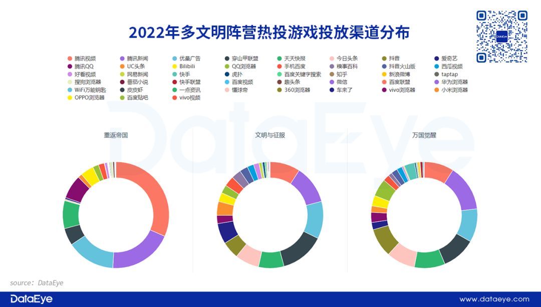 多文明阵营以均衡投放为主,字节系与腾讯系雨露均沾。由于《重返帝国》为腾讯产品,投放渠道则侧重于腾讯渠道,但字节系也有涉及,只是投放量偏少。其他两款阵营产品投放渠道相对均衡。事实上,多文明题材相比于三国题材较为年轻化,用户年龄范围较大,投放渠道也因此更加多元,均衡。