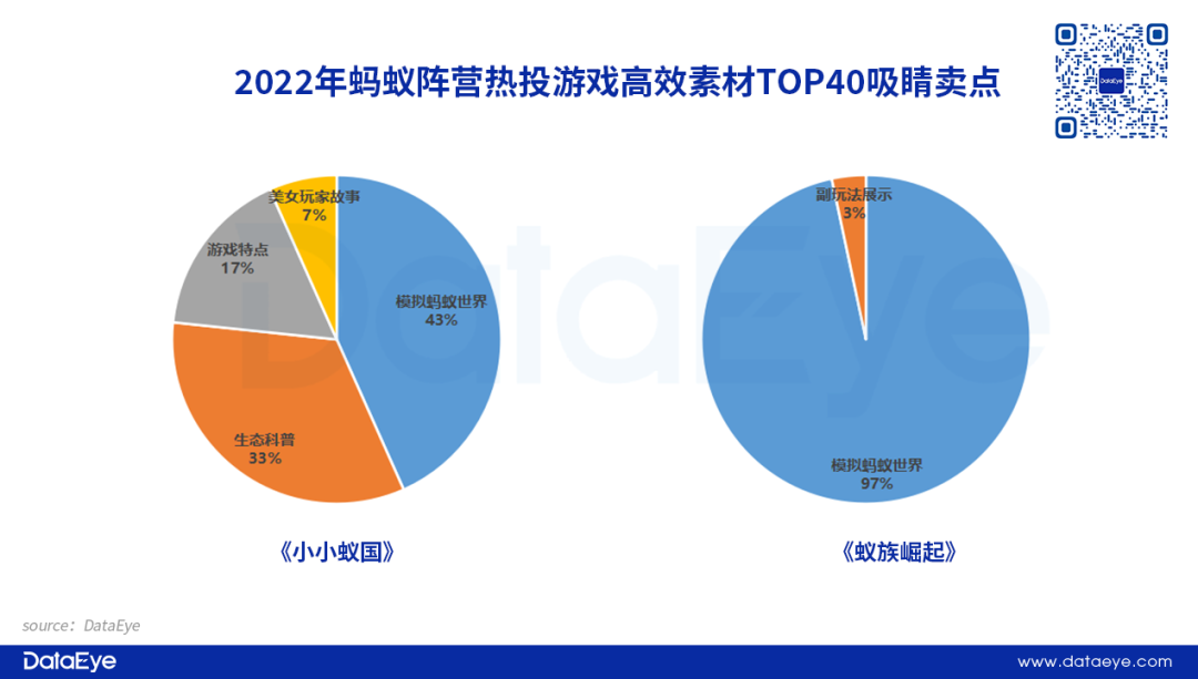 《蚁族崛起》2022年高效素材TOP40比较单一,基本全部采用“模拟蚂蚁世界”的方式来展示游戏基本内容,同时也有突出游戏副玩法要素,但占比较低。