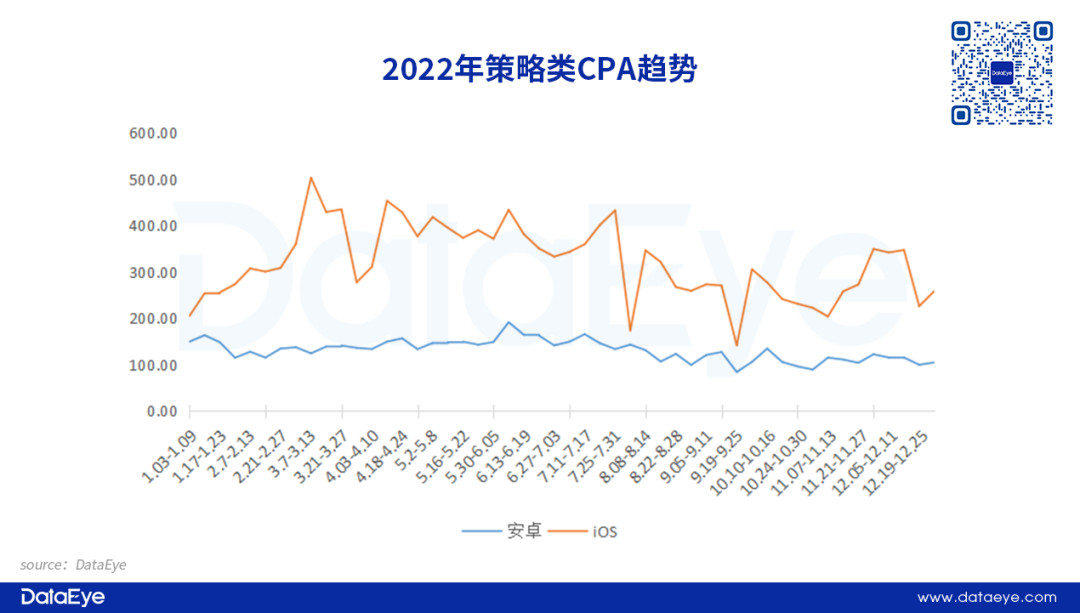 品类CPA方面,策略类iOS端全年平均CPA超过300/A,其中峰值出现在3月初,预估CPA超过500/A。相比之下,安卓端的品类CPA表现稳定,全年维持在200/A以内,而且波动不大。