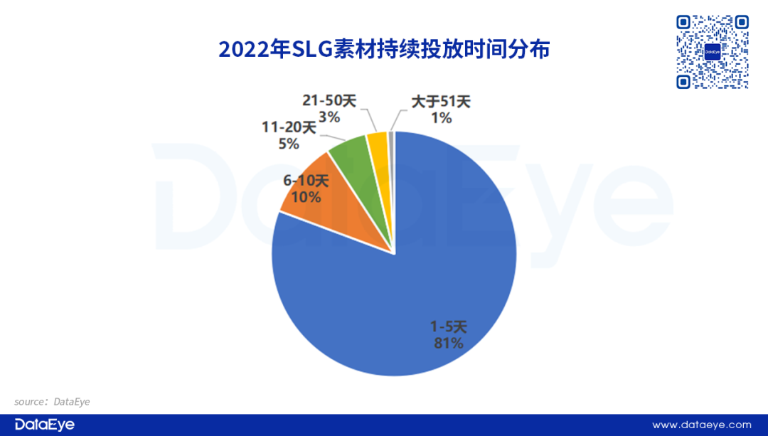 素材使用频率方面,2022年SLG玩法新增素材中,累计投放1—5天(含)的素材占比约为81%,而累计投放大于11天的新增素材约为9%。