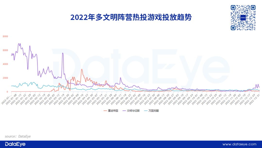 多文明阵营:Q3投放量或腰斩或躺平,影响最大。多文明阵营新品在上线后均有强势的投放表现,但持续时间并不长,投放量回落较快。直到2022年Q3整体呈现躺平趋势,《重返帝国》甚至不做任何投放。DataEye研究院认为,近几年,多文明题材在国内崛起,但并没有出现绝对的头部产品,新游上线抢量能快速收获用户关注,占领市场,但用力过猛会导致后续成本回收时间拉长,厂商压力变大。