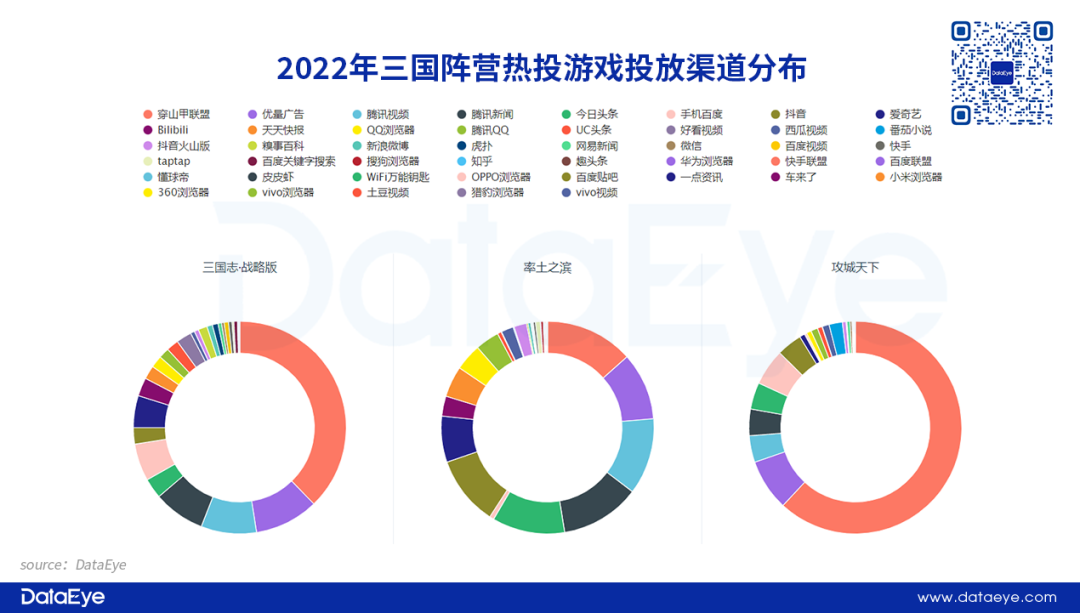 三国阵容在投放渠道有明显分化。投放量较高的《三国志·战略版》和《攻城天下》还是以聚合类平台渠道为主,但全年投放表现中下的《率土之滨》在投放渠道分布更加均衡。整体来看,三国阵营产品投放渠道比较广。