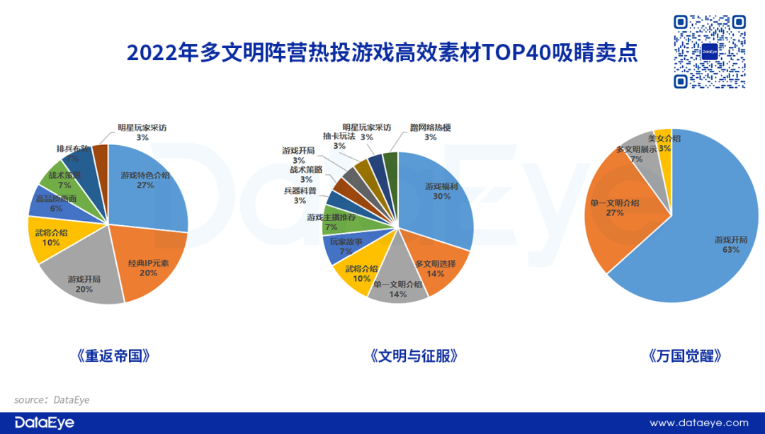 《文明与征服》2022年高效素材TOP40中的游戏卖点较为丰富,其中“游戏福利”要素占比较多,例如上线福利、抽卡福利等等。除此之外,项目组强调游戏多文明核心要素,对各文明阵营进行介绍与讲解。