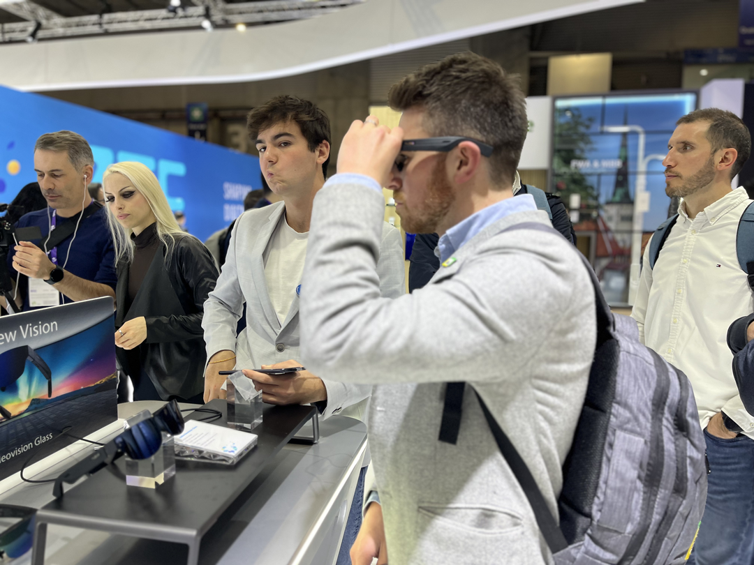 参展顾客在试戴中兴AR智能眼镜nubia Neovision Glass,内含回旋式音仓和立体声全频双扬声器,带来沉浸、真实的聆听体验。图源:李小天 摄