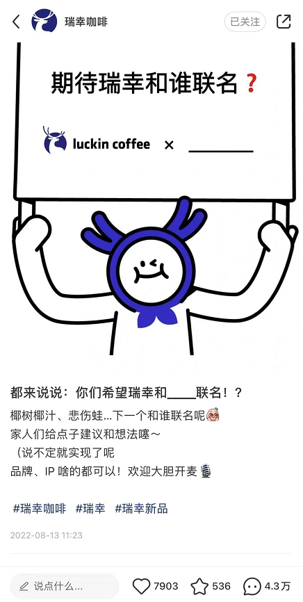瑞幸也不是第一次做网友的“许愿池”了,早在去年8月,就已经在官博发了一条小红书在线征集粉丝期待的联名对象。