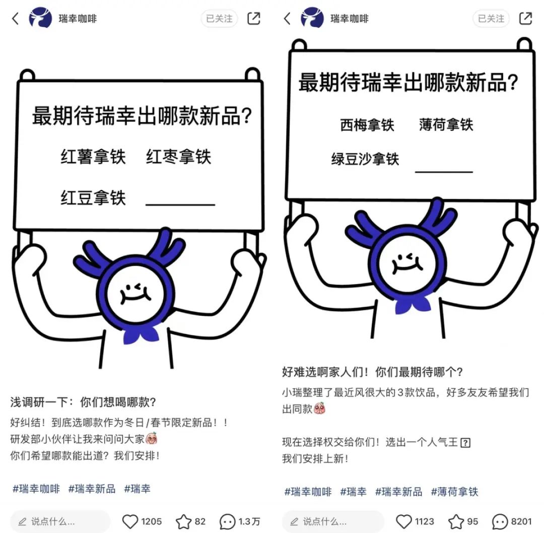 除了让网友提名联名对象,瑞幸还会让网友提名期待的新品,既拿捏了新品预告的热度又拿捏了用户的喜好,可谓一举两得。