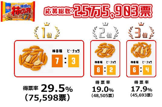 结果,龟田制果共收集到255,903票,“柿种7:花生3”得到了最多的支持(约30%),第二名为8:2,经典的6:4则排在了第三位。