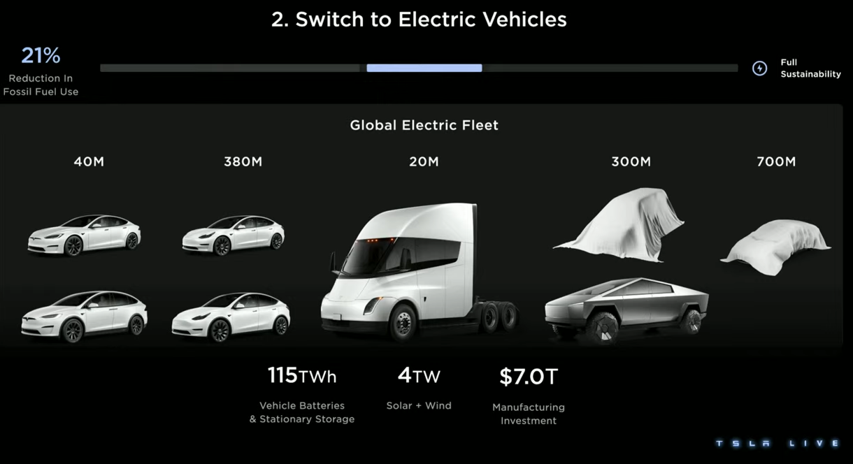 马斯克还对特斯拉如何打造一支全球电动车队进行了畅想,他的假设是该电动车队将拥有约8500万辆电动汽车。