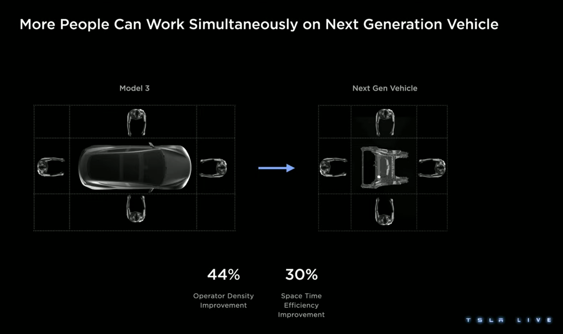 在生产方面,特斯拉对生产流程进行了重新设计,继续减少车身零部件数量。特斯拉将车身进行重新拆解,使其可以在组装时同时进行序列组装和平行组装,更多人将同时参与装配工作,生产效率将由此提升30%。特斯拉称,目标是将下一代汽车组装成本降低50%。