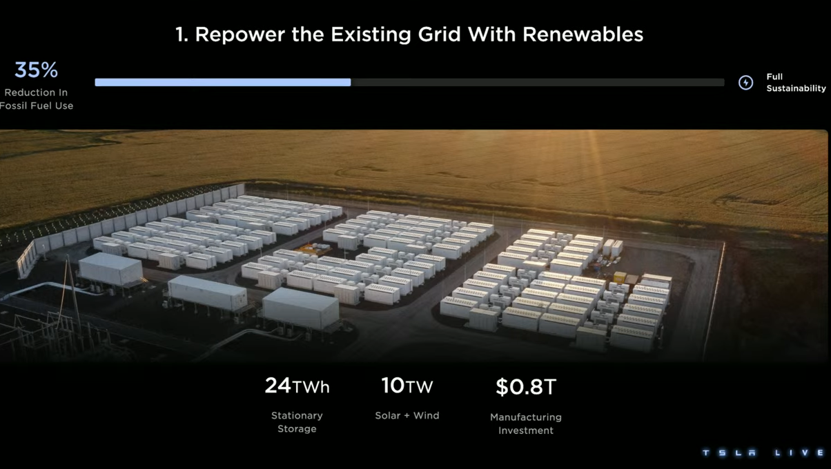 马斯克还向外界介绍了致力于可持续性能源经济的宏图计划,该计划的目标是电池储能达到240TWH、可再生电力达到30TWH,制造领域投资10万亿美元,能源要求为燃料经济的一半以及克服所有资源挑战。