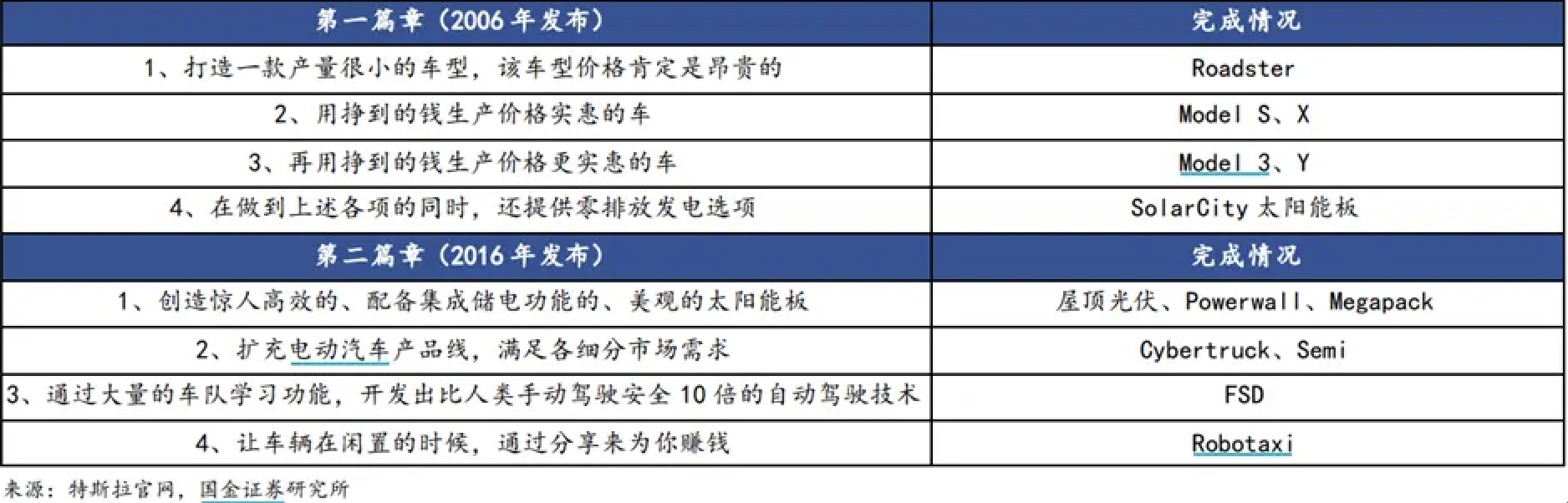 2006年和2016年,马斯克分别公布了其宏图第一篇章和第二篇章。目前,宏图第一篇章已经基本实现,分别对应特斯拉跑车 Roadster、Model S/X、Model 3/Y、SolarCity太阳能业务。