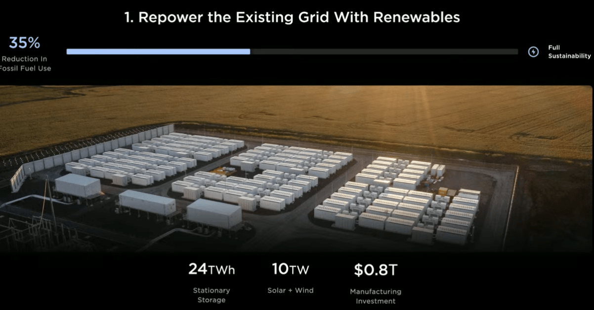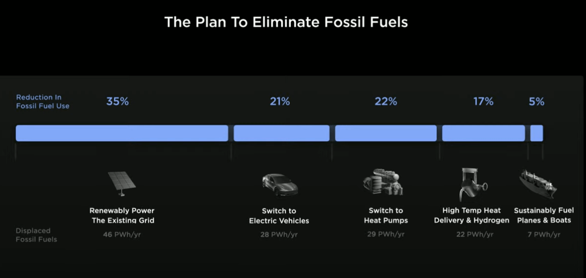 特斯拉希望通过五个领域的变革实现可持续的能源经济:用电动汽车代替内燃机汽车;在家庭、企业和工业生产中改用热泵;在工业过程中实施高温供热和储存;过渡到电动飞机和船只;用可再生能源发电和固定式存储为一切提供动力。