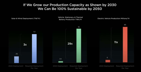 特斯拉展示的图表显示,与2022年相比,如果在2030年前实现风电、太阳能发电装机量增长3倍,动力、储能电池产量增长29倍,电动汽车产量增长11倍,那即可实现在2050年前实现地球能源100%可持续。