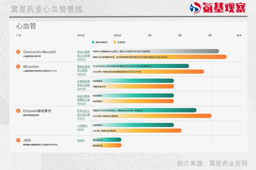 2019年,箕星药业由美国投资机构RTW Investments, LP投资创立。在3年时间里,依靠license in模式,迅速在心血管领域搭建起数条管线。除了Omecamtiv mecarbil,公司还引进了Cytokinetics的aficamten。