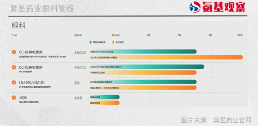 眼科领域,箕星药业同样拥有四款产品,分别为OnAChR激动剂C-01鼻喷雾剂、OC-02鼻喷雾剂,乙酰胆碱受体激动剂LNZ100/LNZ101,以及暂未披露具体情况的JX08。