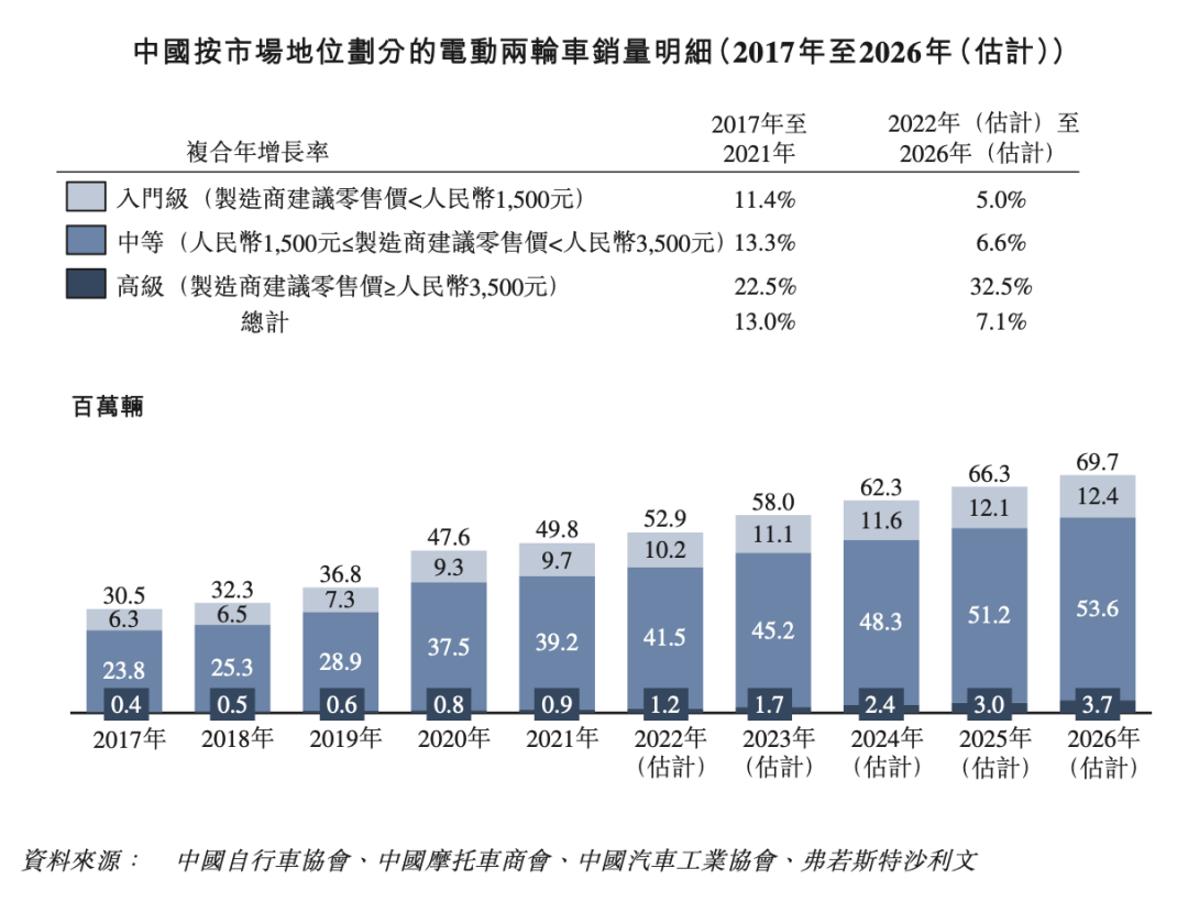 据弗若斯特沙利文(简称“沙利文”)报告数据显示,中国是全球最大的电动两轮车市场,销量由2017年的3050万辆增长至2021年的4980万辆,复合年增长率为13.0%,并在2021年占据全球总销量的75.9%。