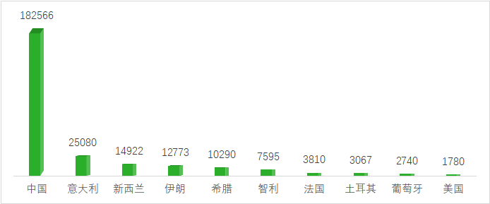 2019年全球猕猴桃主要生产国种植面积,中国以碾压性的优势排名第一数据来源:FAO