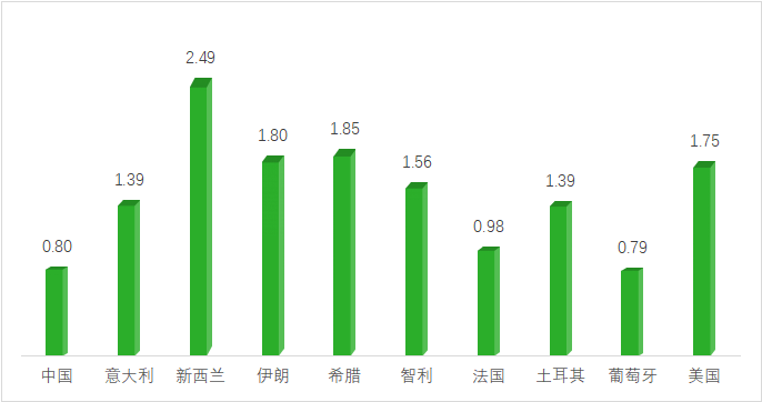 新西兰的亩产是2.49吨,其次是希腊,亩产是1.85吨。