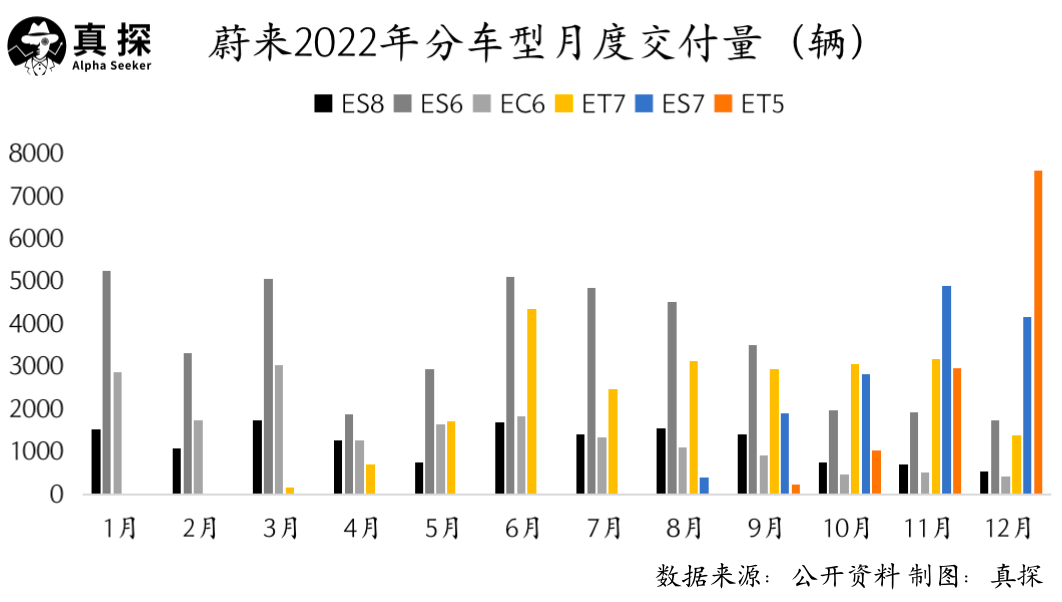 再看蔚来,从全年趋势看,采用新平台NT2.0的新车ET7、ET5、ES7逐渐取代了原有的“866”组合(ES8、ES6和EC6)。四季度,ET7、ET5、ES7交付量占季度总交付量的比例已经达到77.6%。