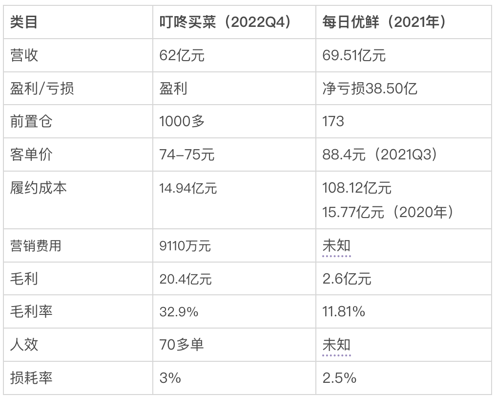 如果毛利率无法覆盖履约成本,将很难看到盈利希望。对比来看,每日优鲜2018-2020年履约费用分别为12.39亿元、18.33亿元、15.77亿元,占总净收入的比重分别为34.94%、30.54%、25.72%。叮咚买菜此次将其控制到了25.25%,这意味着,叮咚买菜在履约成本上,并没有比每日优鲜做得更好,仍有不少优化空间。