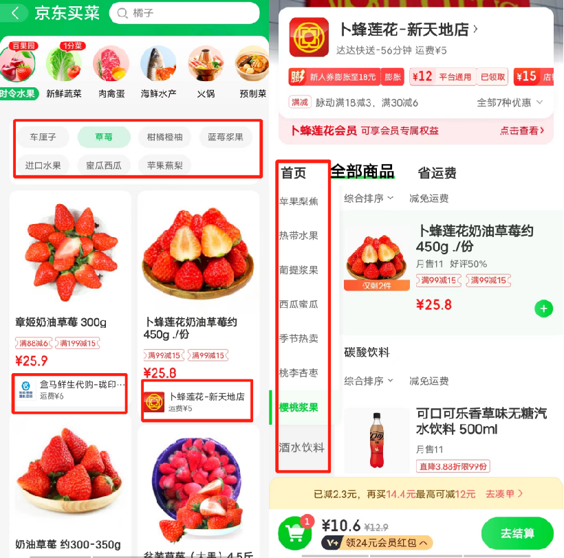 时令水果、新鲜蔬菜、肉禽蛋等6个分类下,先是“类目索引”——如时令水果下,有车厘子、草莓、柑橘橙柚等具体分类,可点击快速筛选跳转;然后是同一商品类目下,不同商家的该类商品以块状平铺方式展示,点击某商品可直接进入该商家,进行商品选购。