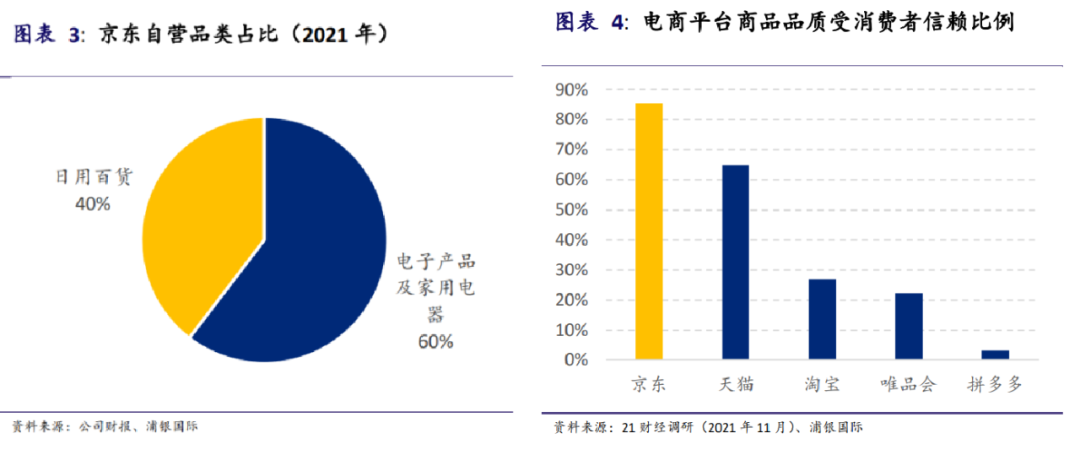 京东作为传统电商在自营品类及商品品质上的优势,图/浦银国际研报