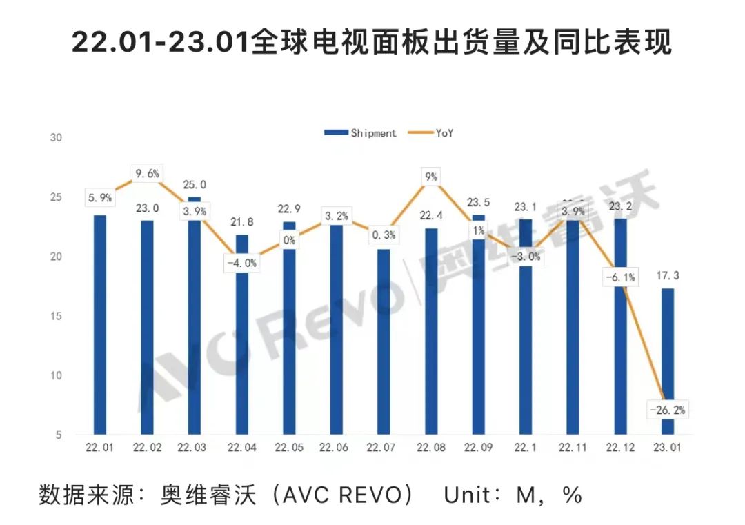 数据显示,经历了去年Q4的上扬后,今年1月TV面板出货量再度大降。根据奥维云网最新数据,1月全球LCD+OLED电视面板出货1730百万片,出货量同比下降26.2%,环比下降25.3%。