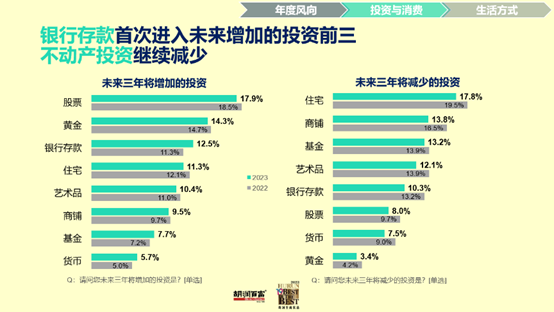 胡润研究院发布的《2023胡润至尚优品—中国高净值人群品牌倾向报告》显示,高净值人群整体经济信心指数为十年来最高水平。从未来三年将增加的投资看,银行存款(13%)首次进入未来增加的投资前三,第一是股票,占比18%,其次是黄金,占比14%。不动产投资(住宅、商铺)继续减少,在未来三年将减少的投资中排在前列。