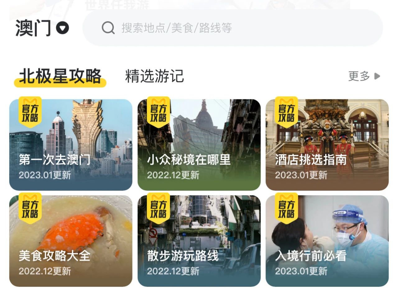 比如,在马蜂窝的澳门北极星攻略中,不再是一篇传统的长图文,而是将攻略分为《第一次去澳门》《小众秘境在哪里》《散步游玩线路》等针对不同玩法的系统化、结构化攻略。