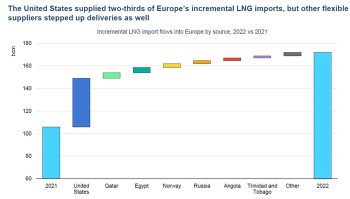 欧洲去年的LNG进口量飙升63%,增加了660亿立方米。新增进口中有三分之二来自美国,其余三分之一来自卡塔尔、埃及、挪威、俄罗斯等。