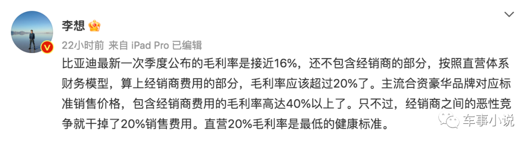 李想给出解释称,比亚迪最新一次季度公布的毛利率是接近16%,还不包含经销商的部分,按照直营体系财务模型,算上经销商费用的部分,毛利率应该超过20%了。主流合资豪华品牌对应标准销售价格,包含经销商费用的毛利率高达40%以上了。只不过,经销商之间的恶性竞争就干掉了20%销售费用。