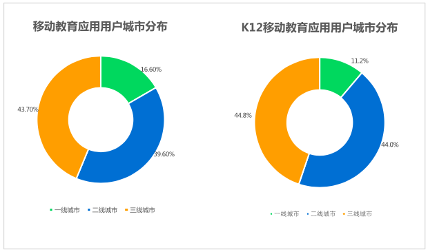 公开整理的数据显示,从地域上划分 ,三线城市是在线教育主要的用户来源地。移动教育应用用户中三线城市占比最大,达到43.7%,而K12移动教育应用用户占比则达到44.8%,集中了大部分“互联网教育刚需用户” ,所以三、四线城市是K12领域一个绝佳的切入点。