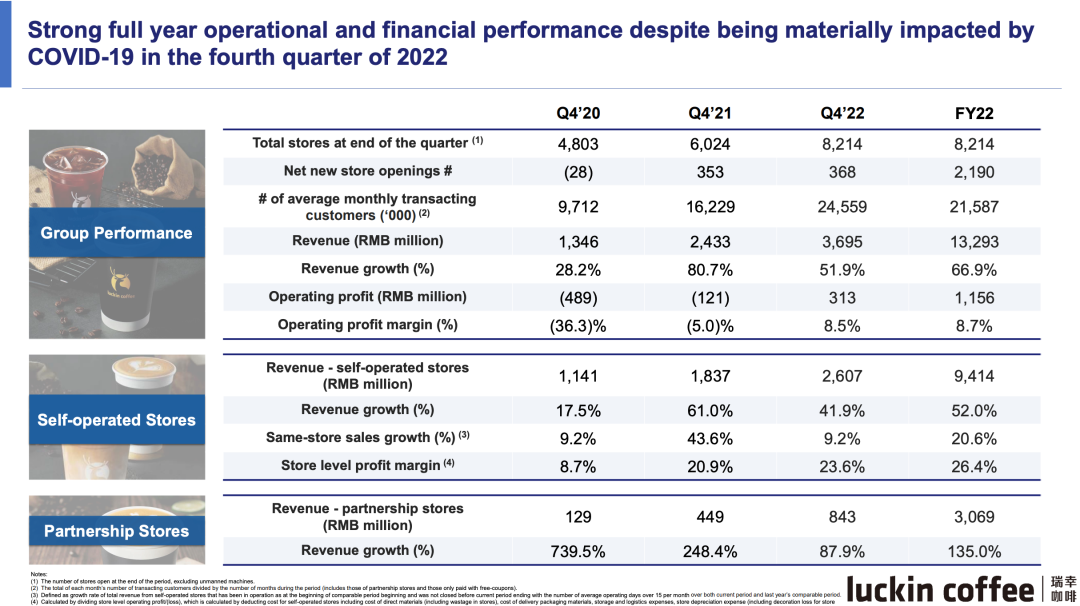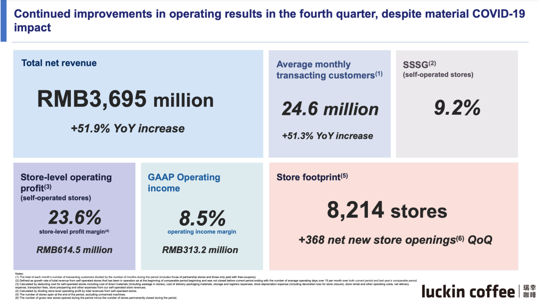 瑞幸指出,尽管四季度受到疫情较大影响,瑞幸仍取得了“强劲的运营和财务业绩”。