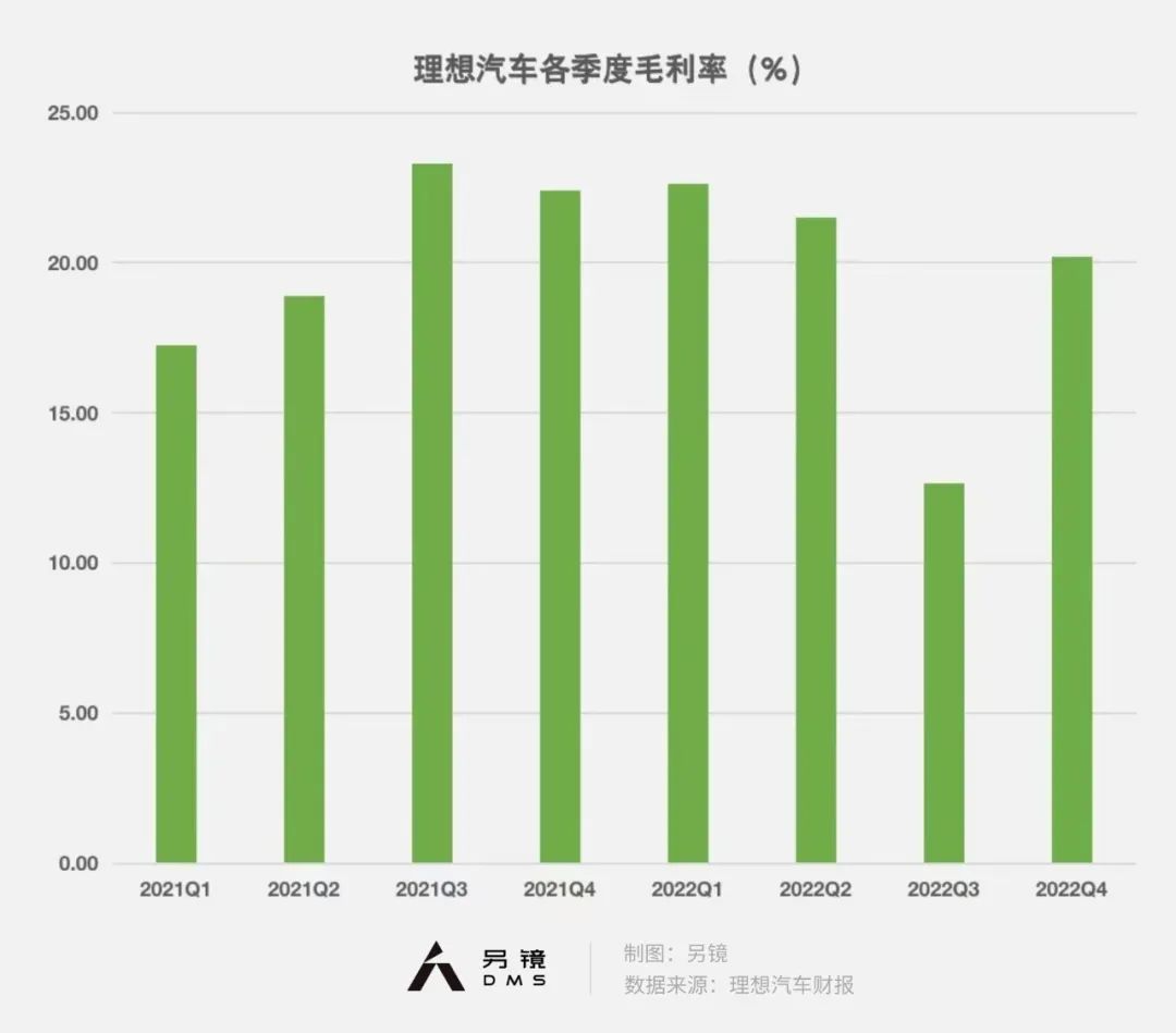值得一提的是,理想汽车2022年一季度、二季度的毛利率为 22.63%、21.51%,略高于四季度的水平。同时,一季度、二季度理想汽车仅有处于交付末期的理想ONE在售,而四季度时,价格更高的理想L9、L8贡献了大部分销售量,但毛利率却较低。