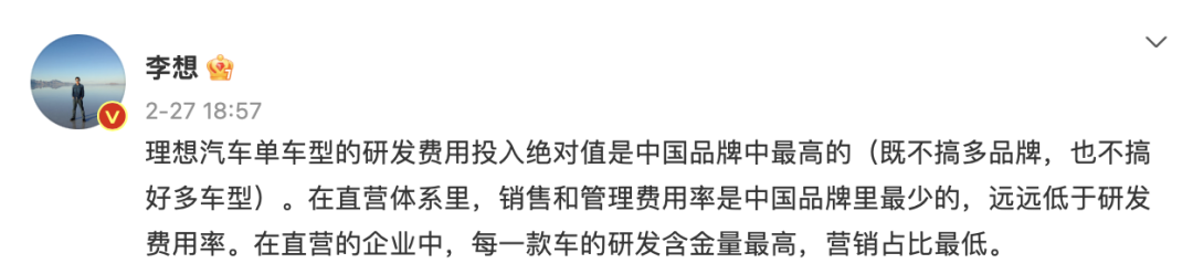 研发金额不占优势,或许是因为理想汽车车型较少。李想在个人微博中表示:“理想汽车单车型的研发费用投入绝对值是中国品牌中最高的,既不搞多品牌,也不搞多车型。”
