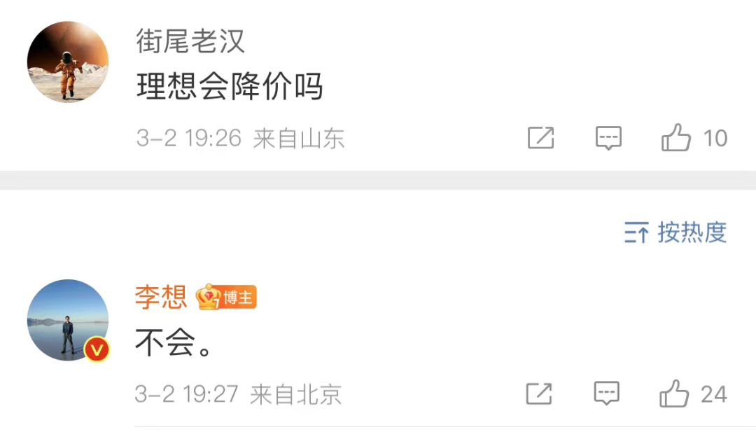 3月2日晚间,有网友留言询问理想新能源车是否会降价,创始人李想直言表示不会。