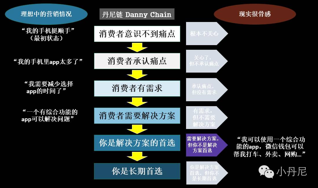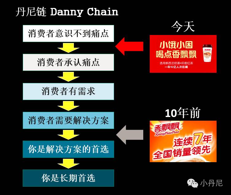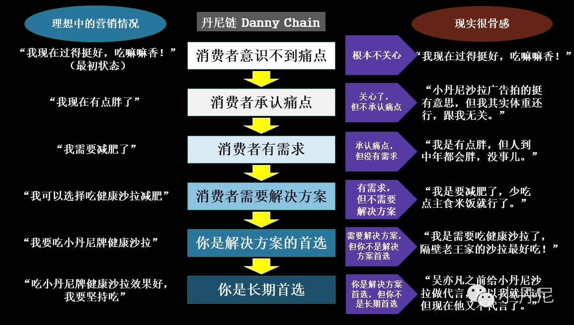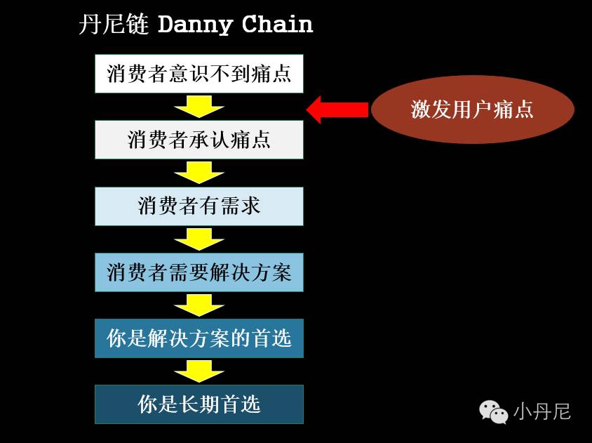 这就是“丹尼链”第一步:消费者是意识不到痛点的,营销人应该从“激发用户痛点”入手,让消费者承认痛点。