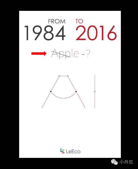 可能乐视的营销人还会沾沾自喜,自以为玩了一个很讨巧的文字游戏,把代表着苹果公司的apple前三个字母划去,变成了乐视的“乐”字拼音le,再加上“From 1984 to 2016”和一个设计奇怪的AI(人工智能)拼接字母,乐视的营销人由衷感叹自己的设计才华: