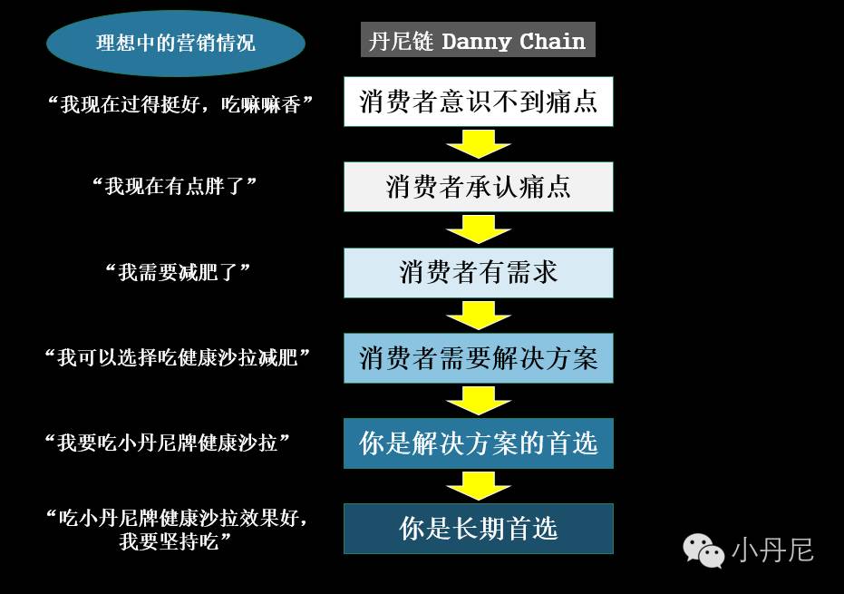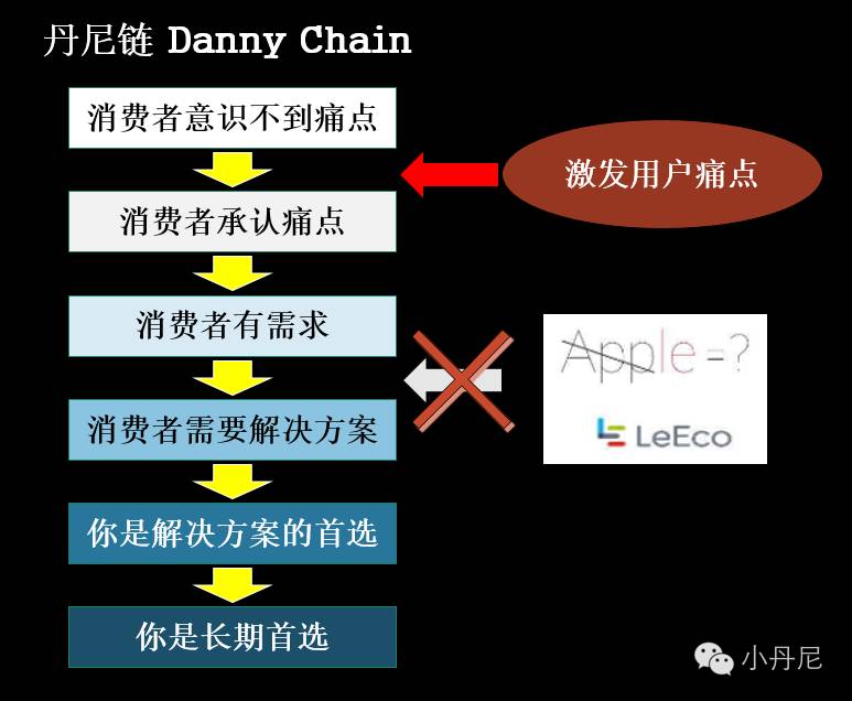 现在你应该知道了“丹尼链”中的第一步:要从“激发用户痛点”入手,让消费者“承认痛点”,接下来我们完整讲一下“丹尼链”。