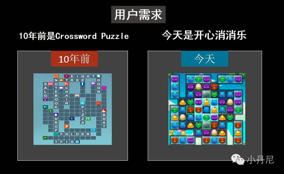 10年前的营销是“Crossword Puzzle”(填字游戏),今天的营销是“开心消消乐”。