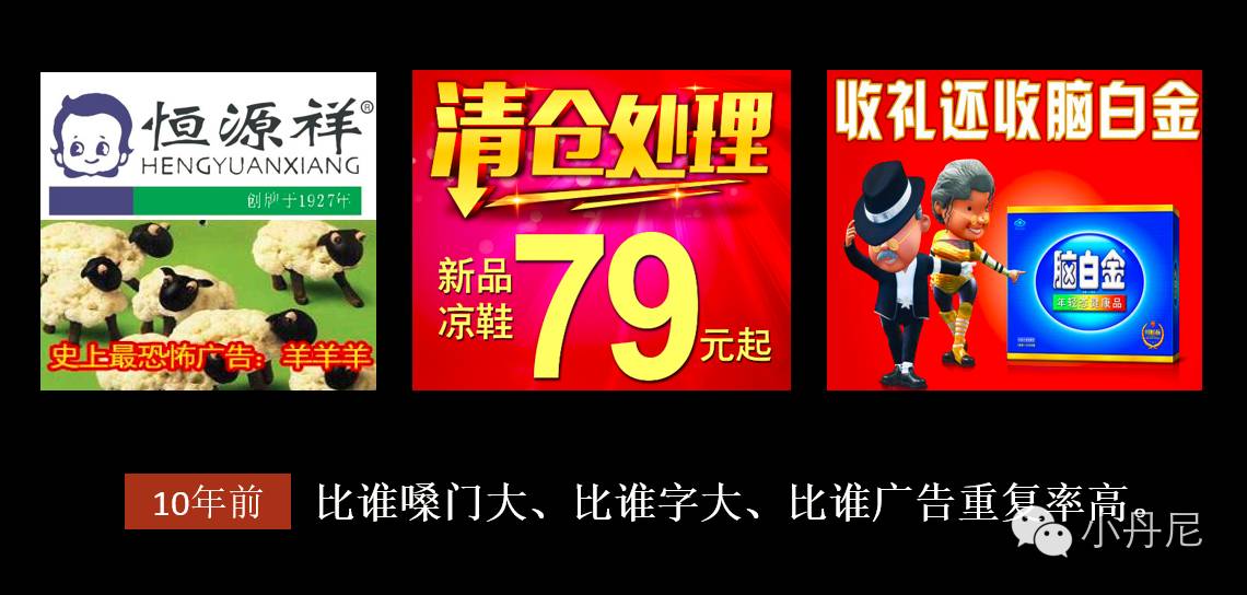 所以你会发现:10年前在中国做营销比拼的是比谁嗓门大、比谁字大、比谁有钱广告重复率高(洗脑)。