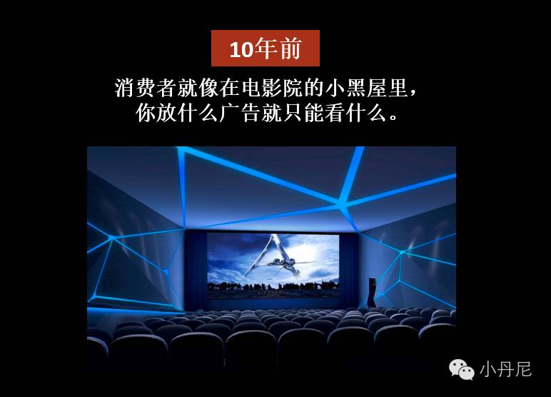 这种“线下流量打广告”的营销策略在10年前有效,因为10年前的消费者就像在电影院的小黑屋里,你放什么广告就只能看什么,自己没有选择权。