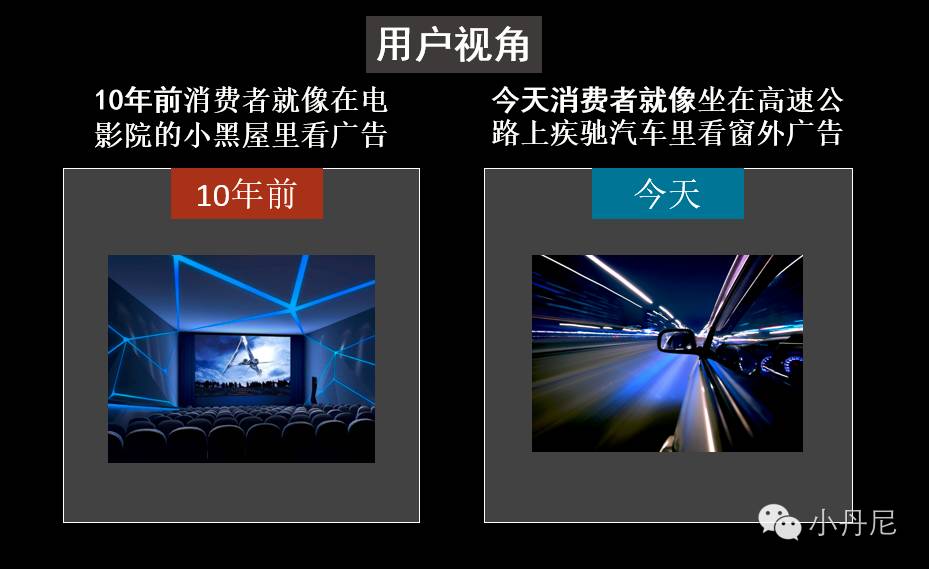 由于品牌增加数远大于用户需求增加数,所以今天的用户看广告,就像坐在高速公路上疾驰汽车里看窗外广告,过滤掉垃圾广告信息。