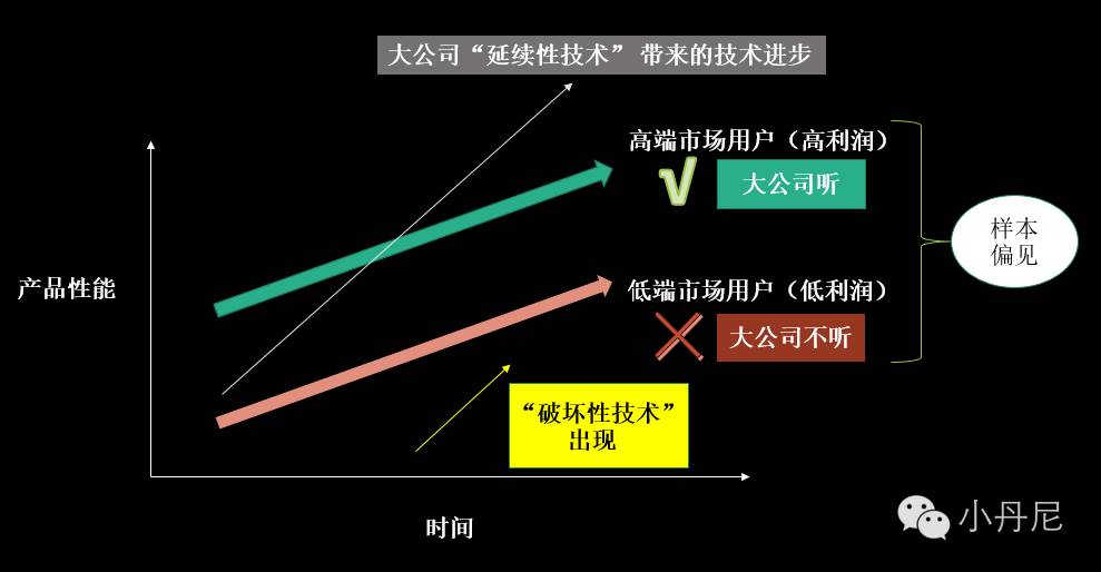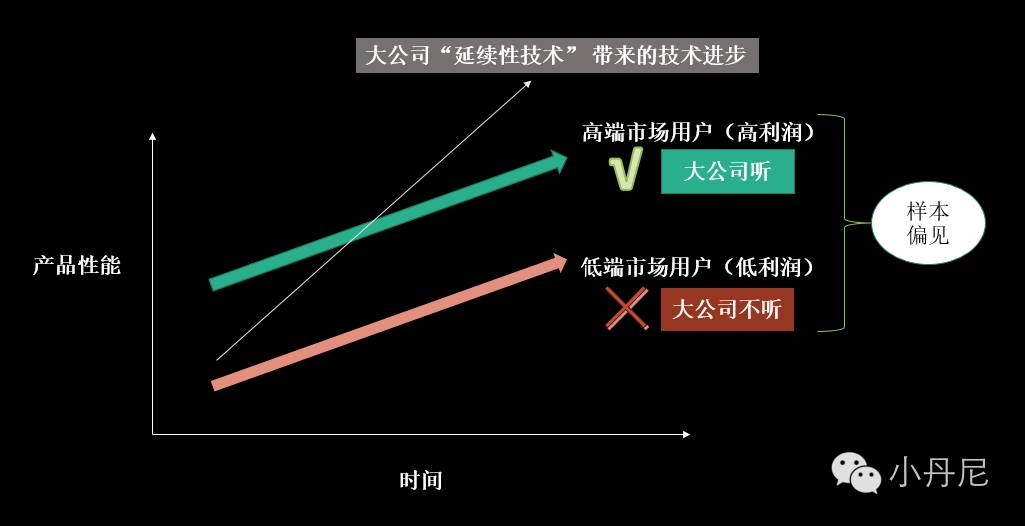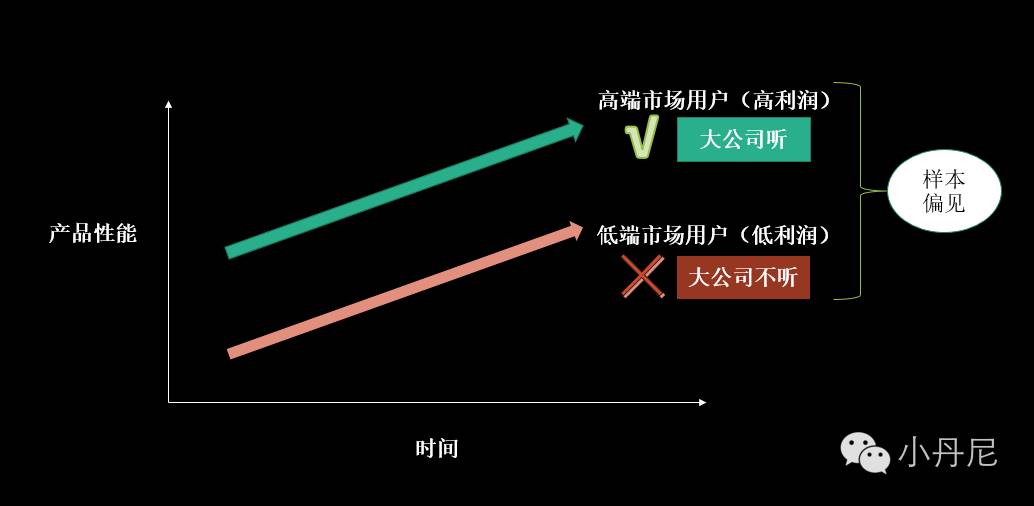 面向高端市场的大公司认为自己“听取用户的建议”,一直在创新,其实只是听取了高端市场用户(高利润)的建议,也就是存在“样本偏见”。