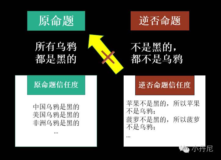 比如增加原命题“乌鸦是黑的”的“信任度”,可以提出论据:中国的乌鸦是黑的,美国的乌鸦是黑的,非洲的乌鸦也是黑的。