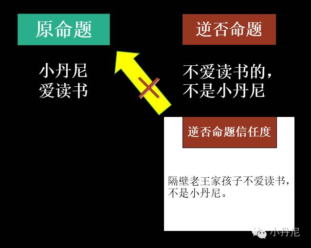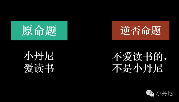 比如原命题是“小丹尼爱读书”,逆否命题是“不爱读书的,不是小丹尼”。