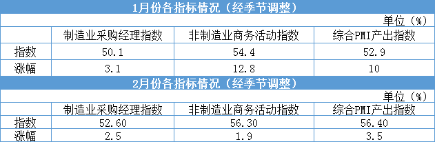 作为经济运行的先行指标,2023年1月份,制造业采购经理指数、非制造业商务活动指数和综合指数均升至扩张区间,2月份PMI指数在荣枯线上继续提高,表明经济全面回升的态势趋于明朗。