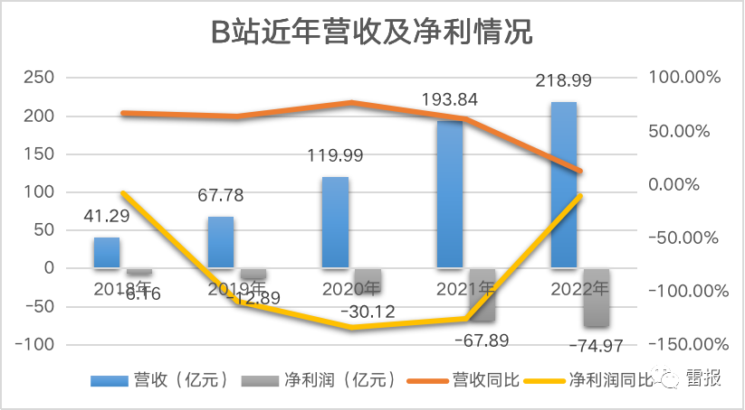 雷报据此获悉:2022全年,B站实现营收218.99亿元,同比增长13%,上年同期为193.84亿元;此外其2022全年的净亏损为74.97亿元,亏损同比扩大10.43%,2021年B站净亏损为67.89亿元。