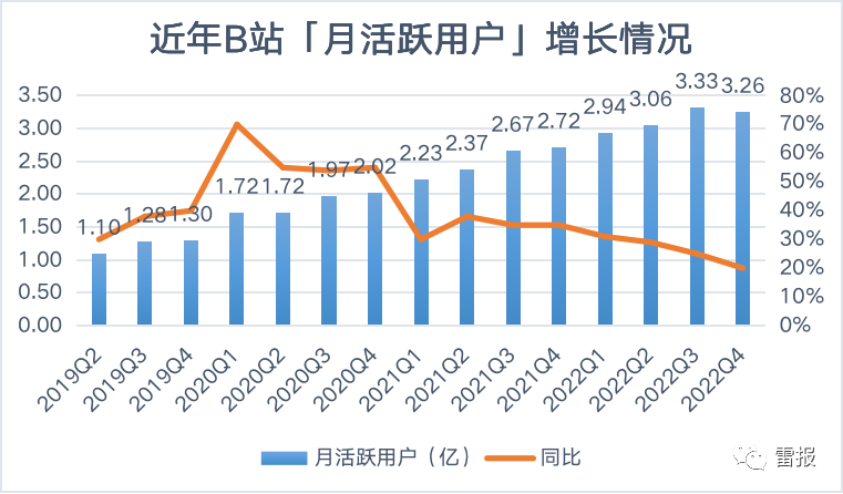 继在2019年成功实现月活用户过亿后,2020年B站在该数据上破2亿,2022第二季度破3亿,该年Q3达3.33亿后,Q4来到了3.26亿,同比增长20%,环比出现下滑。