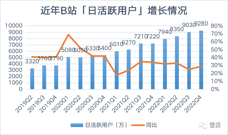 日活方面,继2022年Q2突破8000万后,B站Q3的日活超过了9000万(9030万),Q4为9280万,同比增长29%。